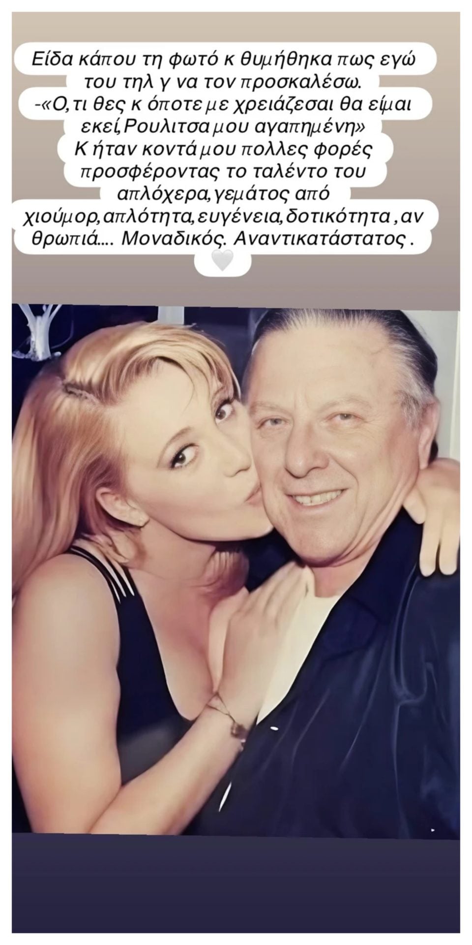 Με λόγια γεμάτα αγάπη και νοσταλγία, η παρουσιάστρια έγραψε: «Είδα κάπου τη φωτό κ θυμήθηκα πως εγώ του τηλ για να τον προσκαλέσω. Ό,τι θες κ όποτε με χρειάζεσαι θα είμαι εκεί, Ρουλίτσα μου αγαπημένη…». Και συνέχισε, σκιαγραφώντας τον χαρακτήρα του: «Και ήταν κοντά μου πολλές φορές προσφέροντας το ταλέντο του απλόχερα, γεμάτος από χιούμορ, απλότητα, ευγένεια, δοτικότητα, ανηθρωπιά…. Μοναδικός, αναντικατάστατος».