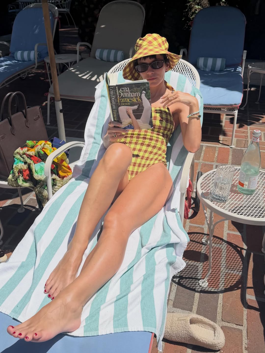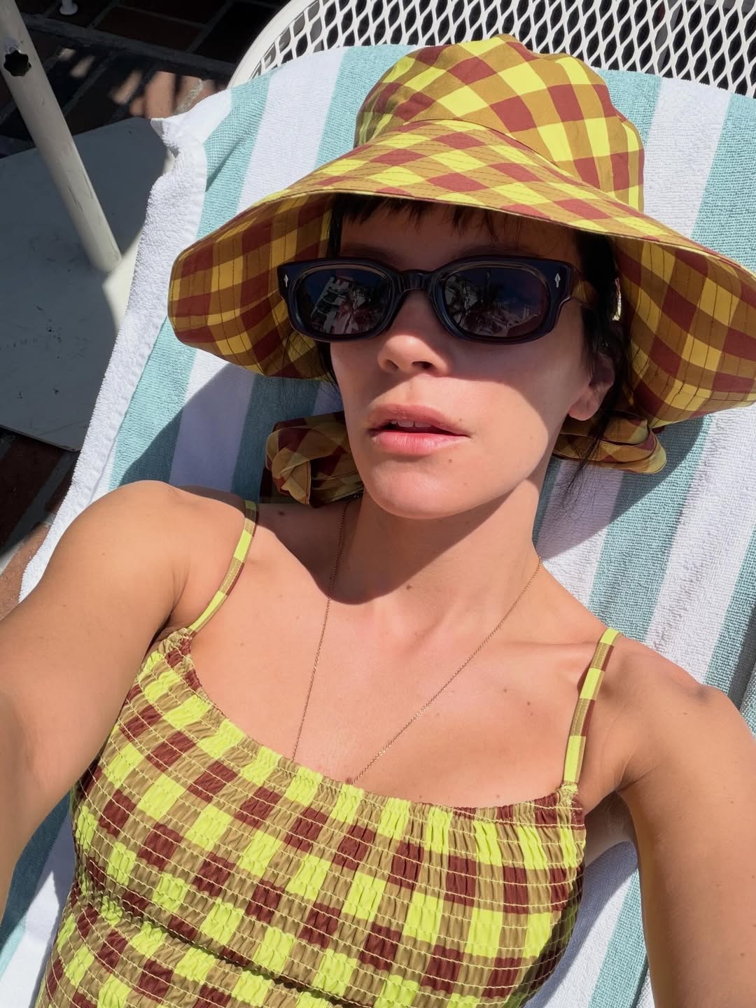 Η 40χρονη τραγουδίστρια ανάρτησε στιγμιότυπα στον λογαριασμό της στο Instagram το Σάββατο 25 Απριλίου, όπου εμφανίζεται να κάνει ηλιοθεραπεία φορώντας καρό ολόσωμο μαγιό, συνδυασμένο με bucket καπέλο και μαύρα γυαλιά ηλίου. Σε άλλες εικόνες ποζάρει με διαφορετικά outfits, ενώ σε ένα από τα στιγμιότυπα διαβάζει το βιβλίο Famesick της Λένα Ντάναμ.