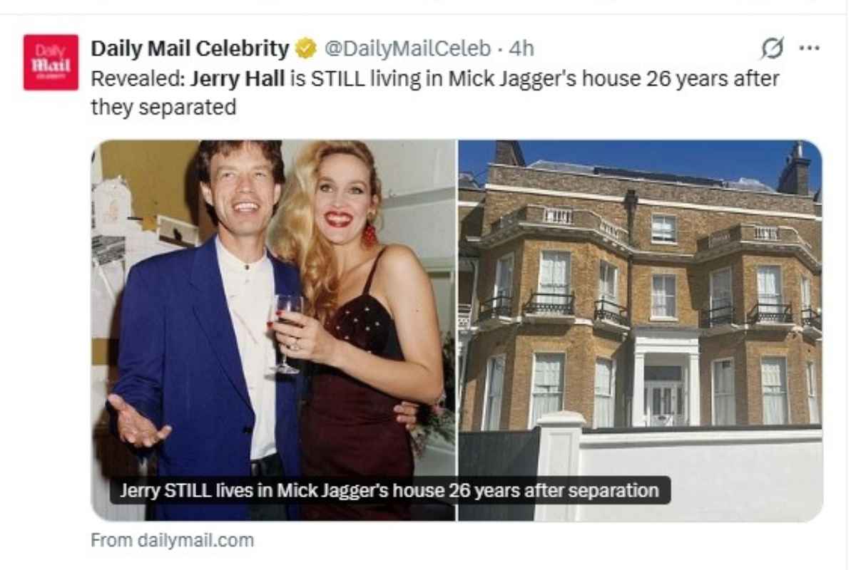 Όπως αναφέρει το δημοσίευμα, τα έγγραφα του Κτηματολογίου δείχνουν ότι ο Μικ Τζάγκερ και η Τζέρι Χολ εξακολουθούν να είναι συνιδιοκτήτες της έπαυλης στο Ρίτσμοντ, παρότι και οι δύο έχουν προχωρήσει στην προσωπική τους ζωή. Η Τζέρι Χολ παντρεύτηκε τον Ρούπερτ Μέρντοχ το 2016 και χώρισε το 2022, ενώ ο Μικ Τζάγκερ είναι πλέον αρραβωνιασμένος με τη χορεύτρια Melanie Hamrick.