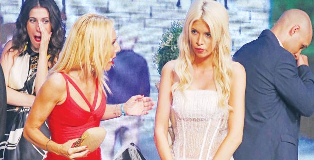 «Εξαλλη» η Ελένη Τσαβαλιά με τη Χριστιάνα Καρνέζη, η οποία φόρεσε νυφικές ζαρτιέρες και ανέβηκε στο Δελφινάριο. Οχι, καμιά σχέση!