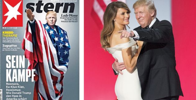 Το «Stern» στο νέο τεύχος του τον εμφανίζει τυλιγμένο με αμερικανική σημαία, να κάνει ναζιστικό χαιρετισμό. Ο τίτλος του περιοδικού, που είναι «Ο αγών του», κάνει αναφορά στο γνωστό αυτοβιογραφικό βιβλίο του Χίτλερ «Ο αγών μου», το οποίο αποτέλεσε το ιδεολογικό μανιφέστο του ναζιστικού κόμματος, ενώ ο υπότιτλος που τον συνοδεύει είναι εξίσου εμπρηστικός: «Νεοναζί, Κου-Κλουξ-Κλαν, ρατσισμός: Πώς ο Ντόναλντ Τραμπ υποδαυλίζει το μίσος στην Αμερική».
