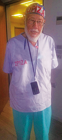 Ο Γιώργος Γρηγοριάδης, πατέρας του γνωστού ηθοποιού Κλέωνα Γρηγοριάδη, δεν κρύβει τις πολιτικές πεποιθήσεις του ούτε όταν φοράει τα ρούχα της δουλειάς. Ετσι, όπως βλέπετε και στις φωτογραφίες που δημοσιοποίησε το iefimerida.gr, ο χειρουργός πρωκτολόγος επιλέγει σκουφάκι το οποίο γράφει με μεγάλα γράμματα «ΣΥΡΙΖΑ», ενώ το ίδιο βλέπει κανείς και στην ιατρική ρόμπα του.