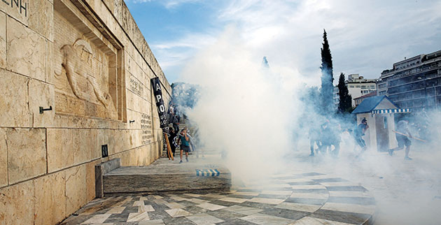 Λίγο μετά τις 7 το απόγευμα τα ΜΑΤ επιτέθηκαν με ασπίδες, γκλομπ και χημικά στο πλήθος στα σκαλιά αριστερά και δεξιά της Βουλής. Ενας διαδηλωτής τραυματίστηκε, ενώ πολλοί αντιμετώπισαν αναπνευστικά προβλήματα. Ενταση επικράτησε και λίγο μετά τις 8, όταν διαδηλωτές παρέδωσαν στους αστυνομικούς έναν νεαρό που κουβαλούσε στην τσάντα του πέτρες και τις πετούσε στα ΜΑΤ.
