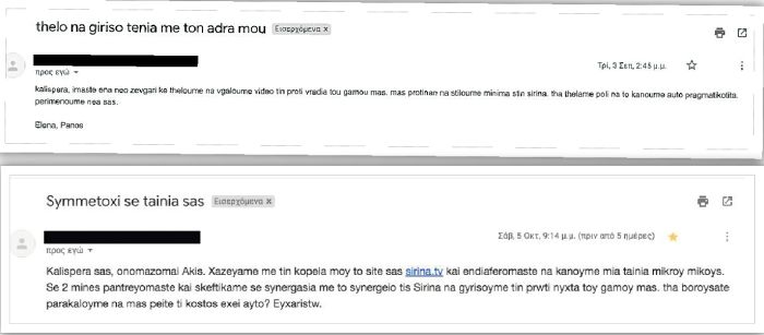 Ένας τρίτος, ο οποίος έχει στείλει e-mail με τίτλο «Ταινία με τη γυναίκα μου» στον «βασιλιά του ελληνικού πορνό», ενδιαφέρεται να μάθει αν η εταιρία γυρίζει βίντεο με περιπτύξεις νιόπαντρων, ενώ ένα ζευγάρι γράφει στο μήνυμά του: «Καλησπέρα. Είμαστε νέο ζευγάρι και θέλουμε να βγάλουμε βίντεο την πρώτη βραδιά του γάμου μας. Μας πρότειναν να στείλουμε μήνυμα στη Sirina. Θα θέλαμε πολύ να το κάνουμε αυτό πραγματικότητα. Περιμένουμε νέα σας».