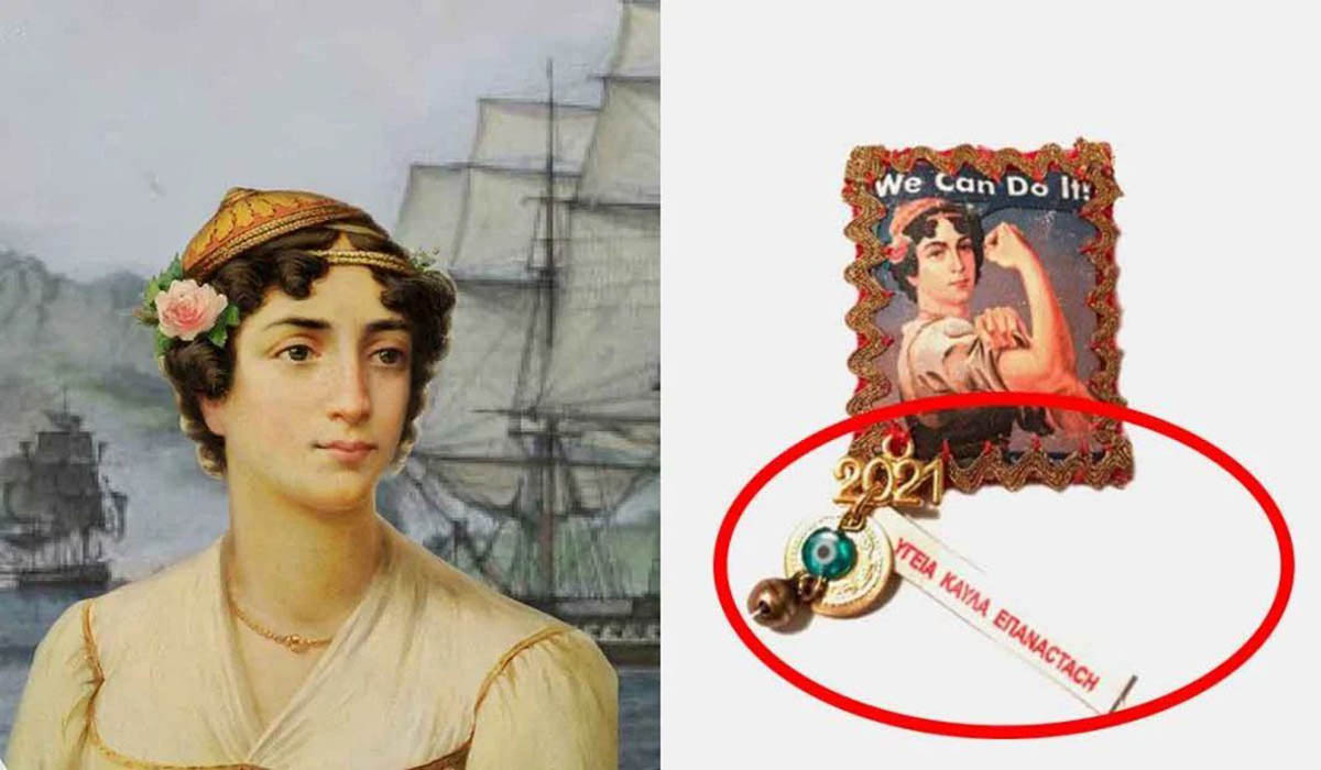 Στο εν λόγω γούρι, που κοστίζει μάλιστα 25 (!) ευρώ, η εμβληματική Μυκονιάτισσα, η οποία τιμήθηκε από τον Ιωάννη Καποδίστρια με τον βαθμό της αντιστρατήγου για τη συνολική προσφορά της στον Αγώνα, εικονίζεται με ρούχα εργάτριας να σηκώνει το μπράτσο της, όπως η γυναίκα με την μπαντάνα στα μαλλιά στη διάσημη αμερικανική αφίσα του 1943 που έφτιαξε ο J. Howard Miller για τη Westinghouse Electric, ώστε να ενισχύσει το ηθικό των εργατριών στον Β΄ Παγκόσμιο Πόλεμο!