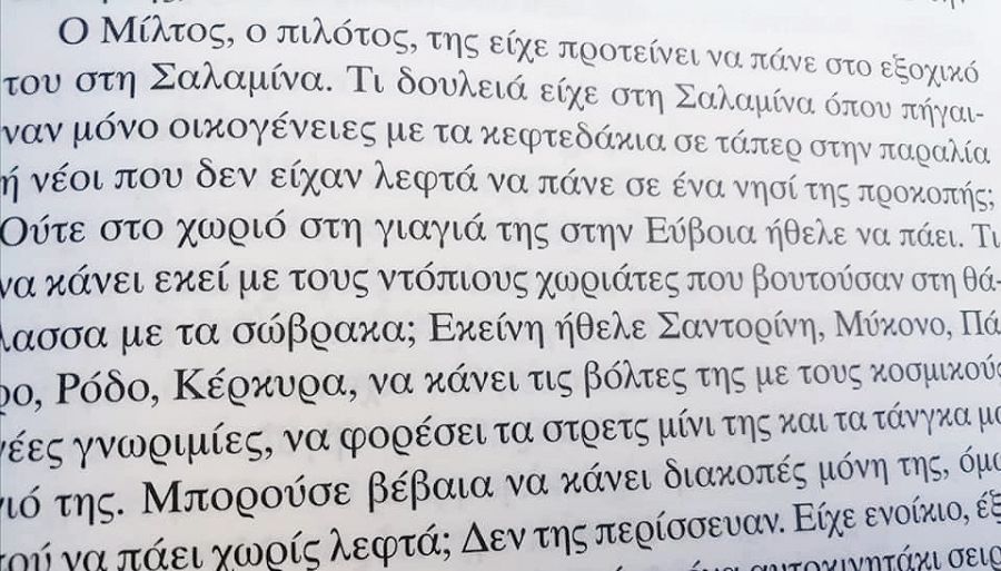 Χαρακτηριστικά αναφέρει η συγγραφέας στο νέο της βιβλίο με τίτλο «Το παιχνίδι του νάνου», μιλώντας για τη Σαλαμίνα: «Ο Μίλτος, ο πιλότος, της είχε προτείνει να πάνε στο εξοχικό του στη Σαλαμίνα. Τι δουλειά είχε στη Σαλαμίνα όπου πήγαιναν μόνο οικογένειες με τα κεφτεδάκια σε τάπερ στην παραλία ή νέοι που δεν είχαν λεφτά να πάνε σε ένα νησί της προκοπής; Εκείνη ήθελε Σαντορίνη, Μύκονο, Πάρο, Ρόδο, Κέρκυρα, να κάνει τις βόλτες της με τους κοσμικούς, να φορέσει τα στρετς μίνι της και τα τάνγκα μαγιό της».