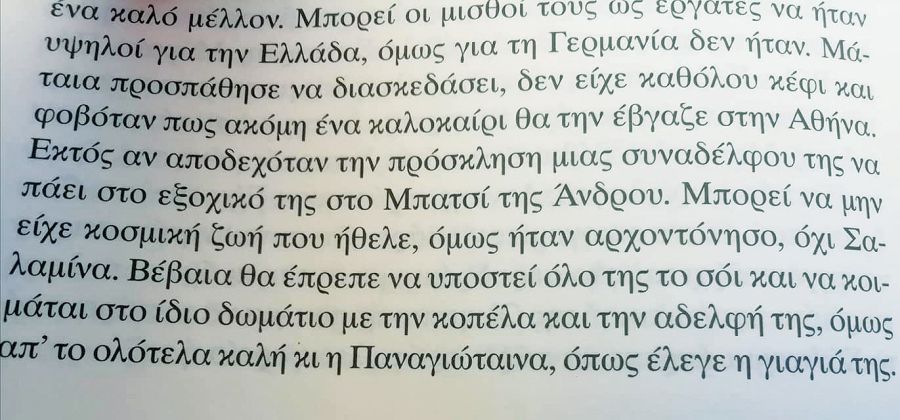 Και συνεχίζει γράφοντας με υποτιμητική πένα για τους κατοίκους του νησιού: «Εκτός αν αποδεχόταν την πρόσκληση μιας συναδέλφου της να πάει στο εξοχικό της στο Μπατσί της Ανδρου. Μπορεί να μην είχε την κοσμική ζωή που ήθελε, αλλά ήταν αρχοντόνησο, όχι Σαλαμίνα!»