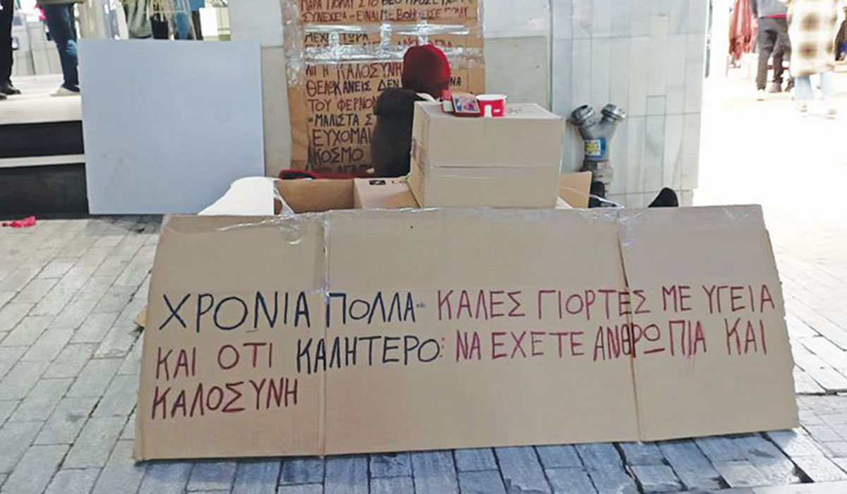 Λίγο παρακάτω στην οδό Ερμού συναντήσαμε τον Γεράσιμο, που μόλις έχει στολίσει το δικό του χριστουγεννιάτικο σκηνικό γράφοντας σε χαρτόνι «Χρόνια Πολλά, Καλές Γιορτές με Υγεία και ό,τι Καλύτερο να έχετε, Ανθρωπιά και Καλοσύνη».