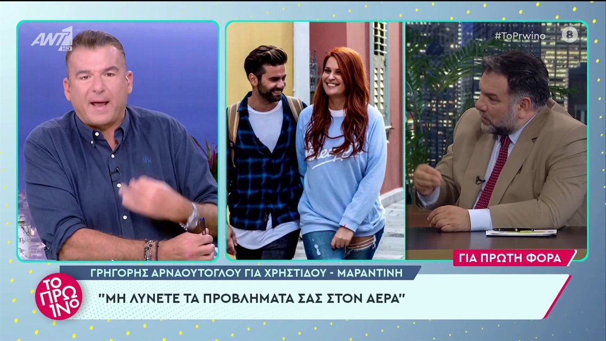 Και συνέχισε: «Πρώτον οφείλω μια απάντηση στον Γρηγόρη Αρναούτογλου. Να ξεκαθαρίσω κάτι Γρηγόρη, πριν από τρεις – τέσσερις ημέρες η Φωτεινή δεν το είχαμε συζητήσει ανέφερε βάση ρεπορτάζ πως ο Μαραντίνης έχασε την επιμέλεια των παιδιών. Ο Θοδωρής ενοχλήθηκε από το ρεπορτάζ και του είπα αν θέλει να έρθει να μιλήσει. Για πρώτη φορά θα πω πως πήρα και ενημέρωσα τη Σίσσυ ότι θα έχω καλεσμένο τον Θοδωρή.