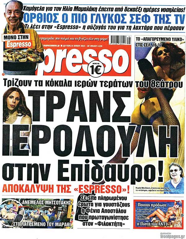 Μέχρι τη Βουλή των Ελλήνων έφτασε τελικά το πρωτοσέλιδο «βόμβα» της «Espresso», που προκάλεσε αίσθηση, καθώς αποκάλυψε τη διπλή ιδιότητα της τρανς καλλιτέχνιδος της Επιδαύρου Φένιας Αποστόλου.