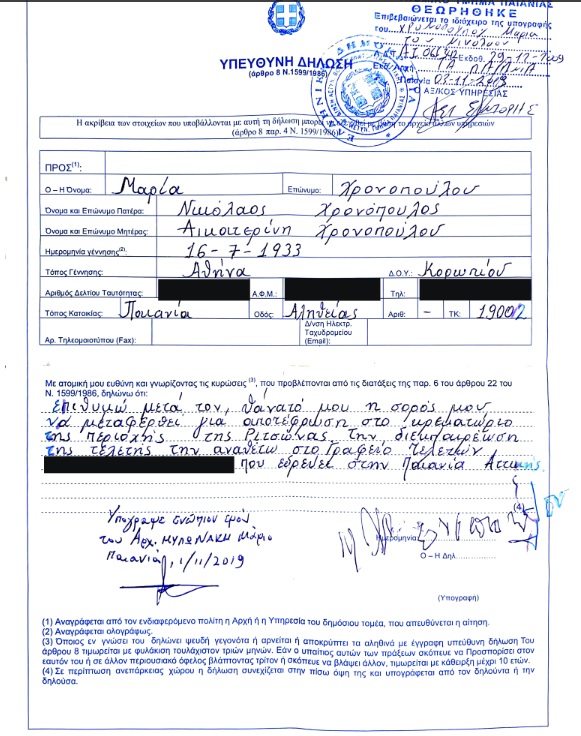 Ένα ντοκουμέντο που δεν είναι άλλο από την επικυρωμένη από τις Αρχές υπεύθυνη δήλωσή της με την υπογραφή της και τα πλήρη στοιχεία της και την οποία η σπουδαία κυρία του κινηματογράφου είχε παραδώσει σε γραφείο τελετών της Παιανίας προκειμένου να μεριμνήσει για την καύση της στο αποτεφρωτήριο της Ριτσώνας, όταν θα ερχόταν εκείνη η μαύρη για τους θαυμαστές της και τον κόσμο του κινηματογράφου ημέρα.