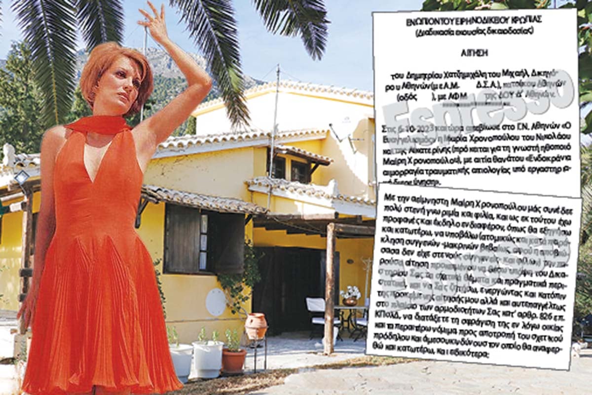 «Κατέθεσα σήμερα, 24/10/2023, αιτήσεις προς το ειρηνοδικείο Κρωπίας και το Α.Τ. Παιανίας, προκειμένου να διαταχθεί αυτεπαγγέλτως η σφράγιση της οικίας της αείμνηστης Μαίρης Χρονοπούλου, ώστε να διασφαλιστούν τα κινητά πράγματα, αντικείμενα, έγγραφα κ.λπ. που υπάρχουν σε αυτή, και δη προσωπικά της αντικείμενα που έχουν μεγάλη εκ διαθέσεως αξία, όσο και ένα πλήθος κινητών πραγμάτων και αντικειμένων ιδιαίτερης πολιτιστικής και συναισθηματικής αξίας, όπως εικόνες, πίνακες, αντίκες, βιβλία κ.λπ., ώστε να γίνει λεπτομερής απογραφή τους.
