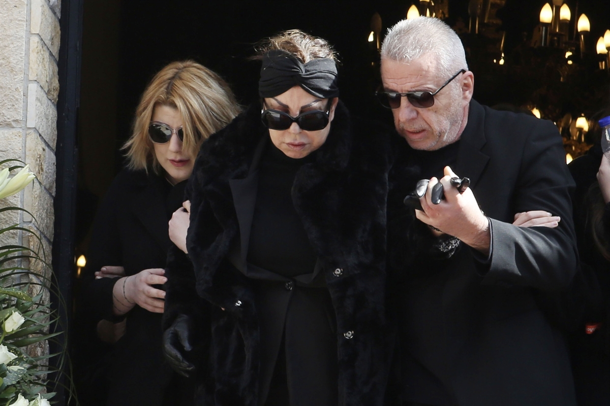 Η Άντζελα Δημητρίου συντετριμμένη έφτασε στην εκκλησία για το τελευταίο αντίο στη μητέρα της κρατώντας το χέρι της κόρης της, Όλγας Κιουρτσάκη.