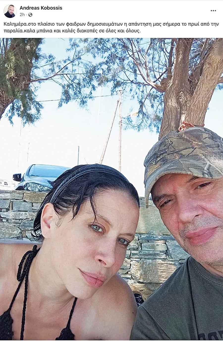 Εντούτοις, ο άγριος καβγάς ανάμεσά τους και ο ξυλοδαρμός που τον συνόδευσε ήρθαν χθες στο «φως» της δημοσιότητας, με τον ίδιο να προχωρά σε ανάρτηση στα μέσα κοινωνικής δικτύωσης, σε μία προσπάθεια να αποκαταστήσει την… υπόληψη της πρώην συζύγου του. «Καλημέρα. Στο πλαίσιο των φαιδρών δημοσιευμάτων, η απάντησή μας σήμερα το πρωί από την παραλία. Καλά μπάνια και καλές διακοπές σε όλες και όλους» έγραψε ο στιχουργός, συνοδεύοντας το κείμενό του με μία φωτογραφία των δυο τους.