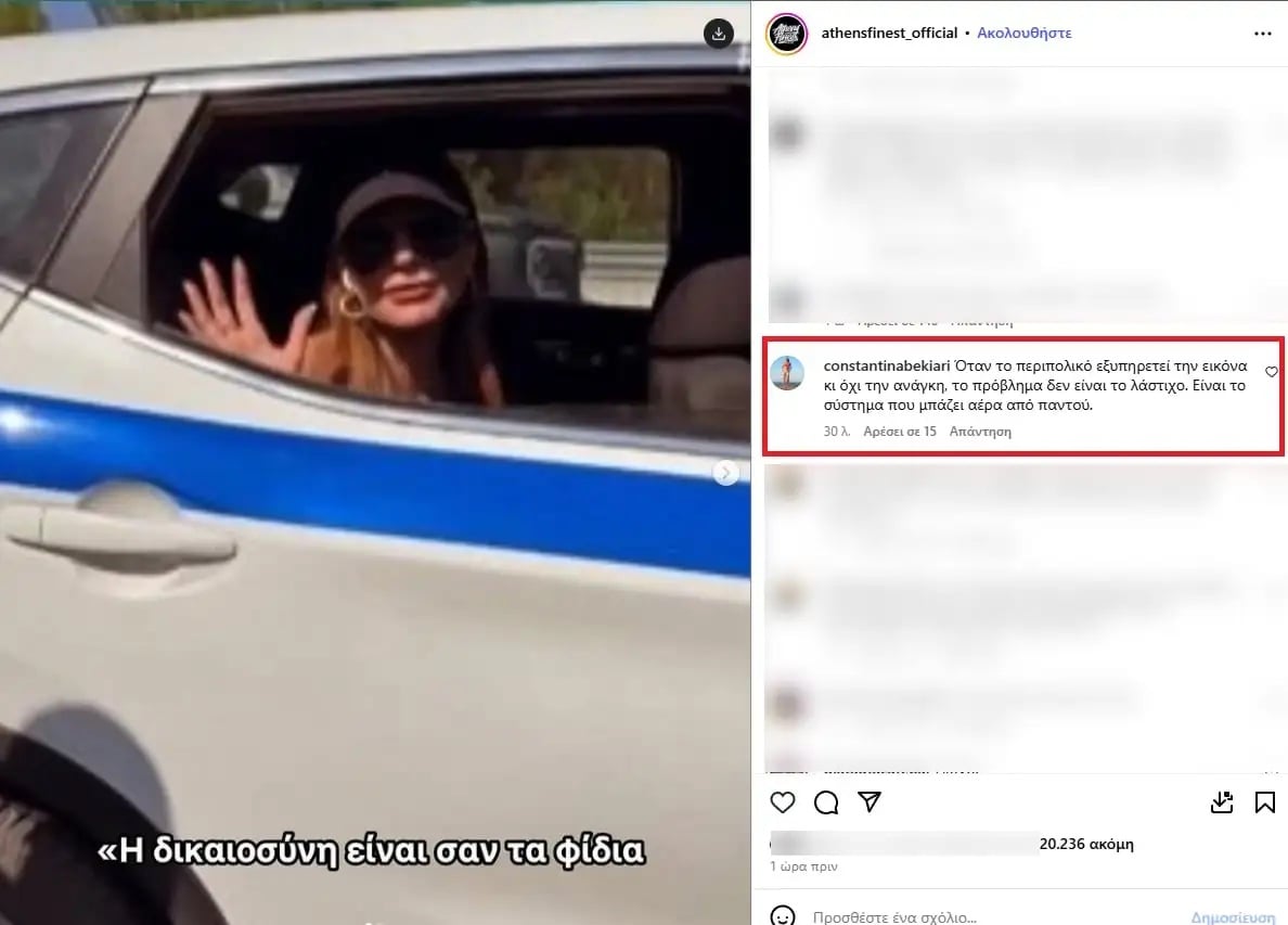 Η Κωνσταντίνα Μπεκιάρη κάτω από ένα ποστ που αφορούσε το θέμα σχολίασε: «Όταν το περιπολικό εξυπηρετεί την εικόνα και όχι την ανάγκη, το πρόβλημα δεν είναι το λάστιχο. Είναι το σύστημα που μπάζει αέρα από παντού».
