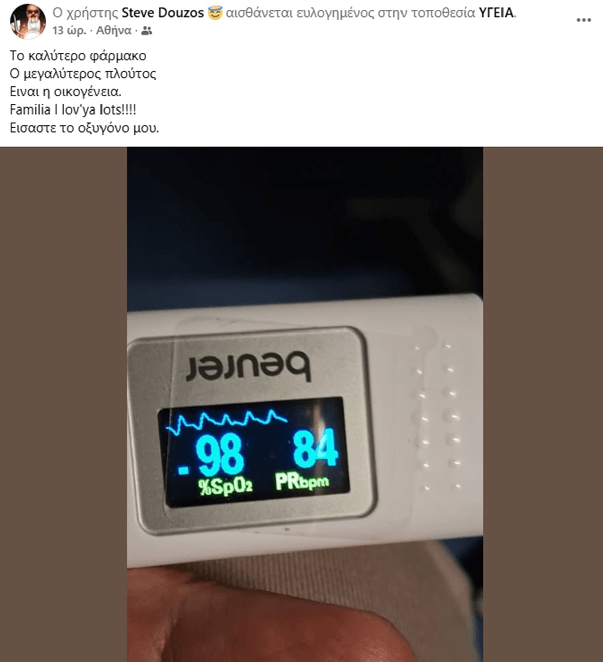 Δημοσίευσε μία φωτογραφία με οξύμετρο μέσα από το νοσοκομείο και έγραψε: «Το καλύτερο φάρμακο. Ο μεγαλύτερος πλούτος είναι η οικογένεια. Familia I lov’ya lots!! Είσαστε το οξυγόνο μου».