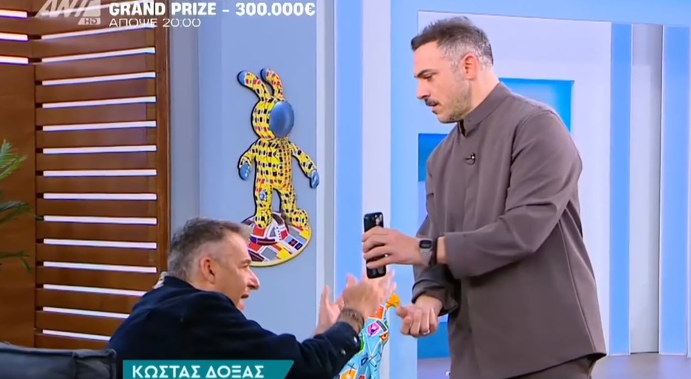Ο τραγουδιστής έβαλε από το κινητό του να παίζει βίντεο όπου ακούγεται η κόρη του να κλαίει. «Θέλω να ζητήσω συγγνώμη από την κόρη μου αυτή τη στιγμή. Δεν θα δείξω, δεν θα δείξω κάτι. Θα παίξω κάτι». Με τον Γιώργο Λιάγκα να προσπαθεί να τον σταματήσει. Όχι, όχι, όχι, μην το κάνεις. Μην το κάνεις Κώστα, μη… Μια στιγμή, μια στιγμή, περίμενε, περίμενε. Μην το κάνεις Κώστα, Κώστα, Κώστα σε παρακαλώ, μην το… κόψτε τον ήχο! Δεν ξέρω, περίμενε μια στιγμή. Κόψτε το, κόψτε το. Τι είναι αυτό; Μην… όχι παιδιά, όχι παιδιά σας παρακαλώ πολύ. Κώστα σε παρακαλώ πάρα πολύ. Μην μου το κάνεις αυτό τώρα.