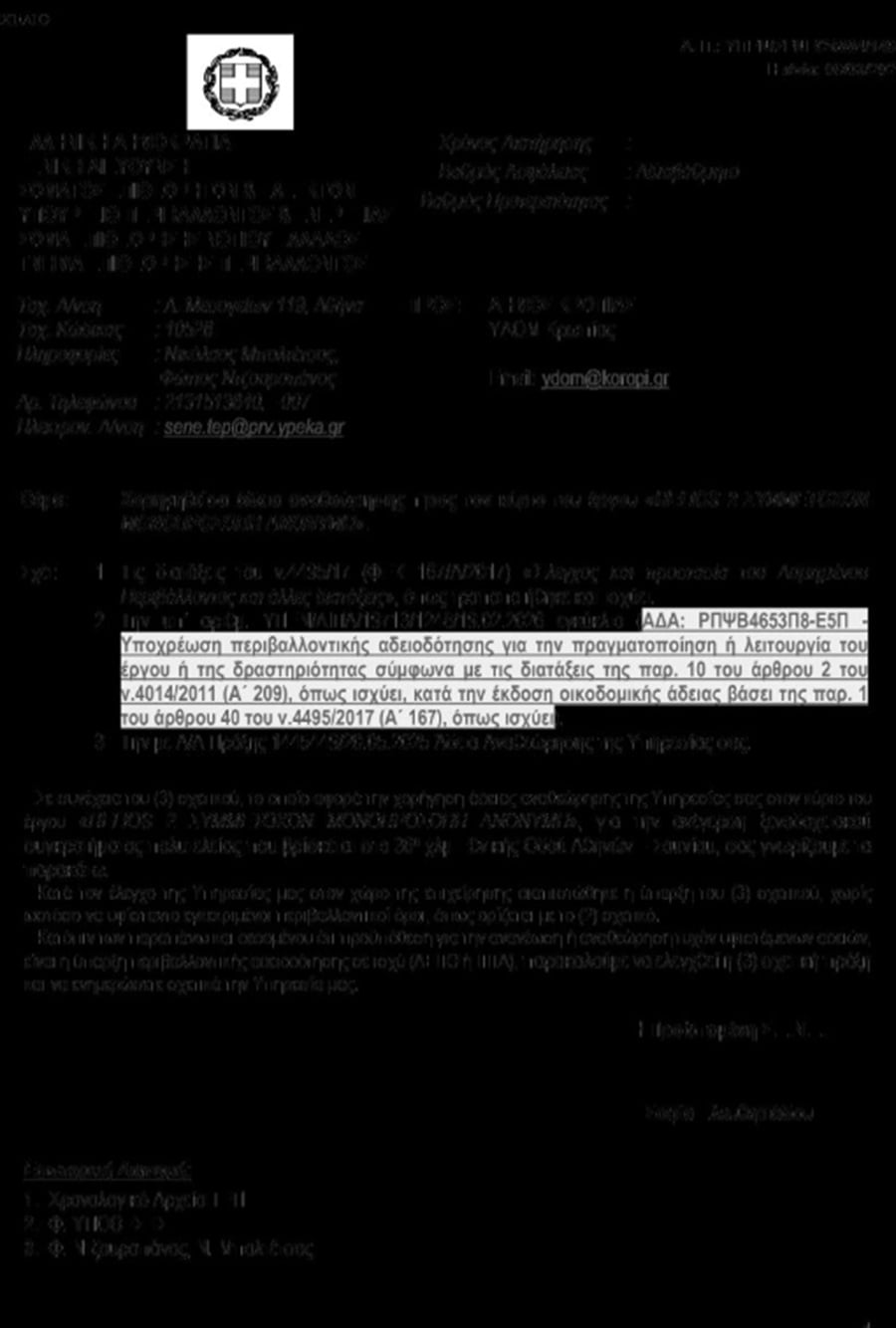 Στο έγγραφο, με αριθμό πρωτοκόλλου 26884/1491, με θέμα «Χορηγηθείσα άδεια αναθεώρησης προς τον κύριο του έργου “Helios 2 Συμμετοχών Μονοπρόσωπη Ανώνυμη”», γνωστοποιείται από την προϊσταμένη των επιθεωρητών προς τον δήμο πως δεν υπάρχουν οι απαιτούμενες περιβαλλοντικές άδειες:
