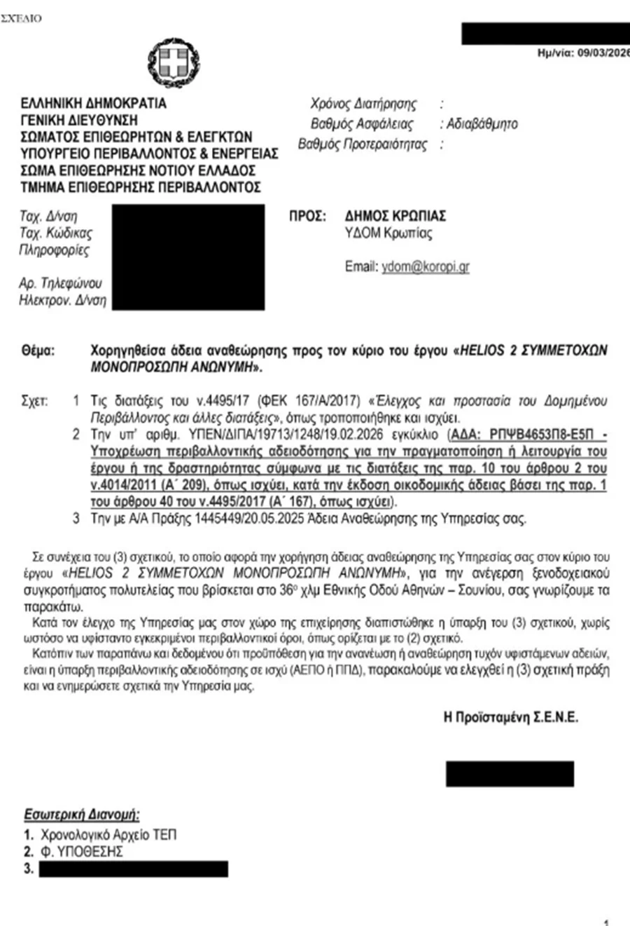 Επομένως, ο φορέας του ελεγχόμενου έργου προέβη σε οικοδομικές εργασίες στατικής ενίσχυσης του φέροντος οργανισμού (όπως αυτές περιγράφονται στην υπ’ αρ. 1445449/20.05.2026 Πράξη Άδειας Αναθεώρησης της ΥΔΟΜ Κρωπίας), ΧΩΡΙΣ ΝΑ ΕΧΕΙ ΧΟΡΗΓΗΘΕΙ Η ΑΠΑΙΤΟΥΜΕΝΗ ΠΕΡΙΒΑΛΛΟΝΤΙΚΗ ΑΔΕΙΑ.