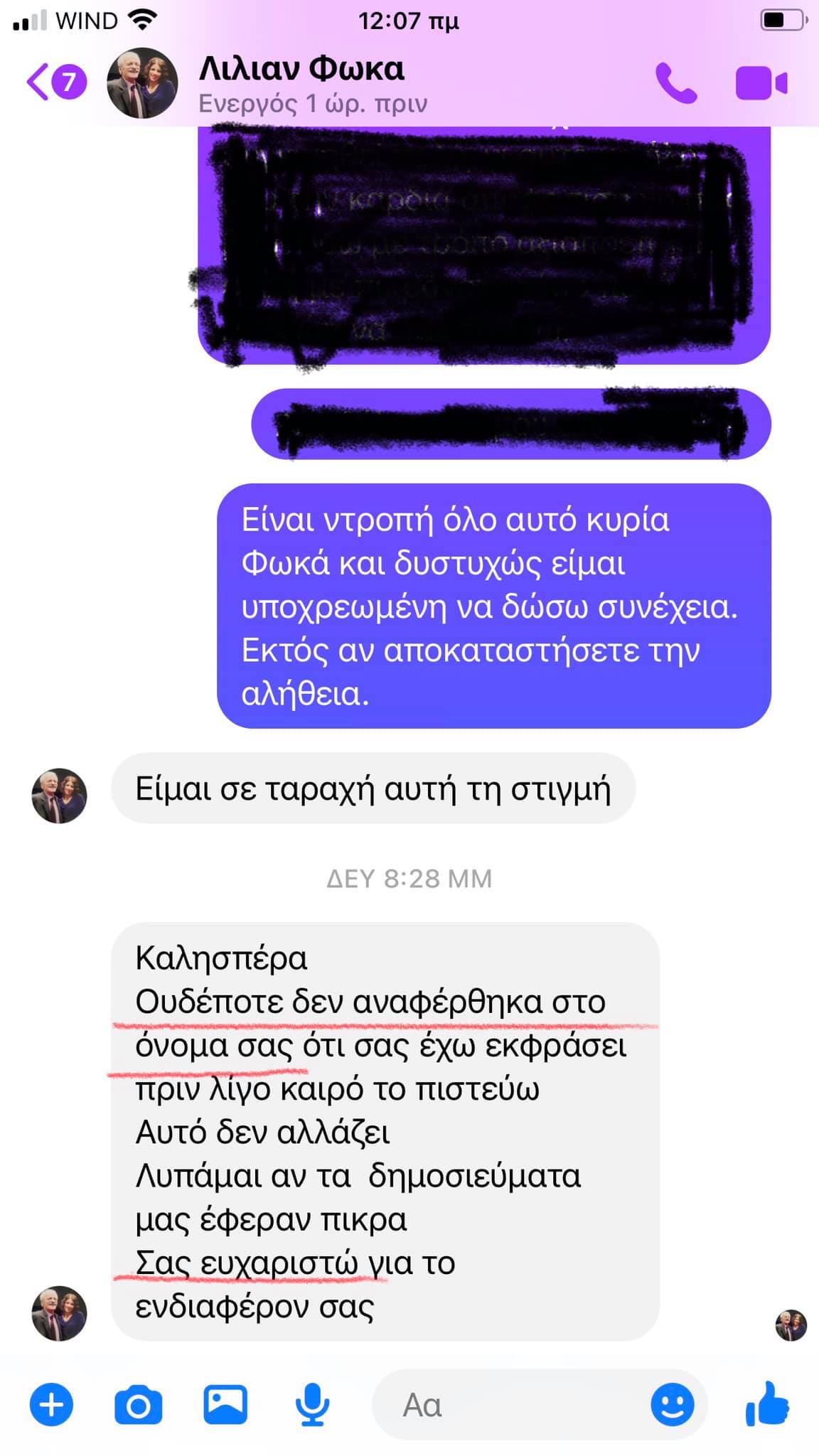 Η Έλενα Ακρίτα επικοινώνησε μαζί της με εκείνη να της εξηγεί πως δεν αφορούσε εκείνη τα όσα έγραψε και δεν έχει κανένα πρόβλημα μαζί της. «Η σύζυγος του Σπύρου Φωκά διευκρινίζει ξεκάθαρα ότι δεν εννοούσε εμένα στην ανακοίνωση της και με ευχαριστεί για το ενδιαφέρον μου. Άλλωστε, όπως γράφω από την αρχή, δεν ανέφερε πουθενά το όνομα μου. Τα φιλοκυβερνητικά μέσα που έσπευσαν να σπιλώσουν την τιμή και την υπόληψη μου θα αντιμετωπιστούν αναλόγως. Δεν δημοσιοποιώ όλη την αλληλογραφία με την κ. Φωκά, επισημαίνω απλώς ότι σε μήνυμα της σε ανύποπτο χρόνο (23/9) μου εκφράζει τον θαυμασμό και την εκτίμηση της», έγραψε η Έλενα Ακρίτα δημοσιεύοντας μέρος της συνομιλίας τους.