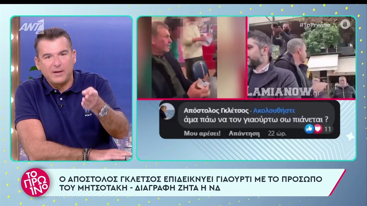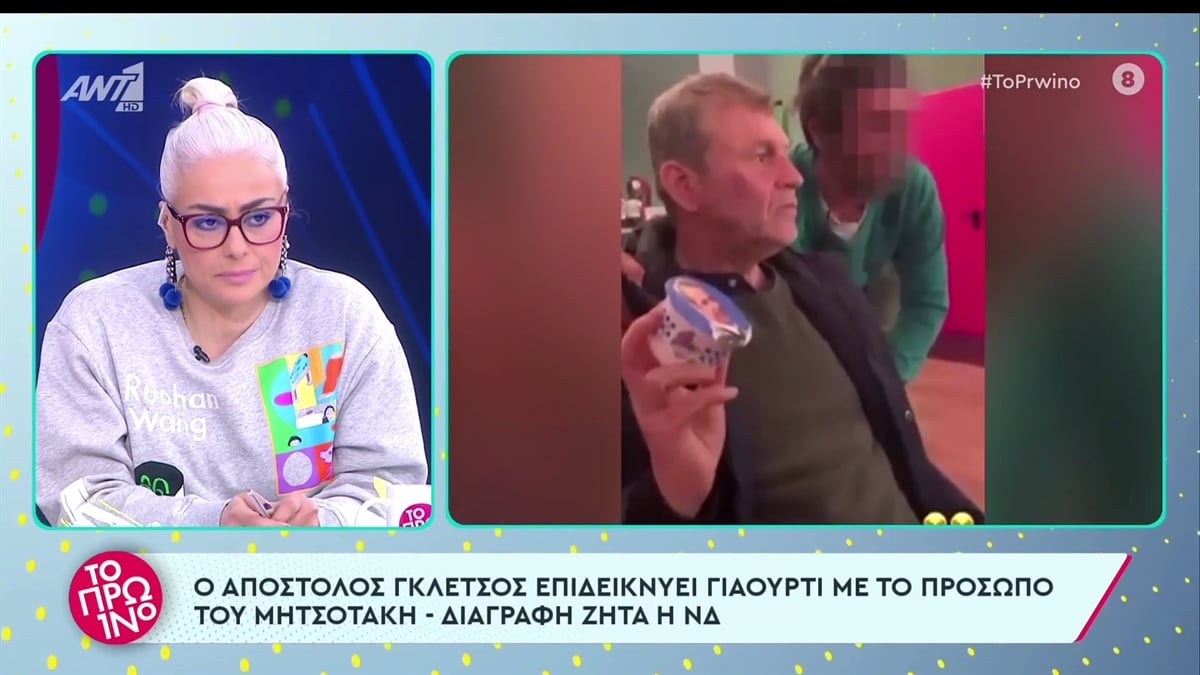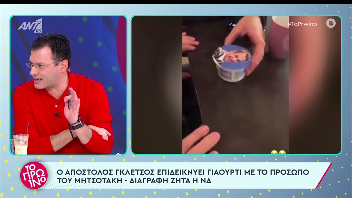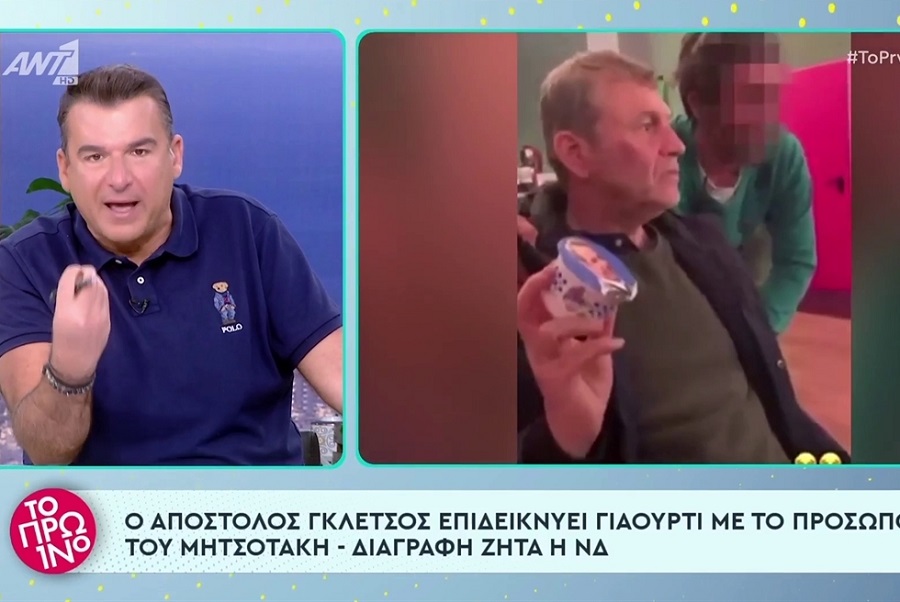 «Και μέσα σε όλα αυτά έχουμε και τον Απόστολο Γκλέτσο. Θα το παίξουμε το θέμα γιατί υποτίθεται είναι και lifestyle. Φωτογραφήθηκε χθες με ένα γιαούρτι που έχει πάνω το πρόσωπο του Κυριάκου Μητσοτάκη.