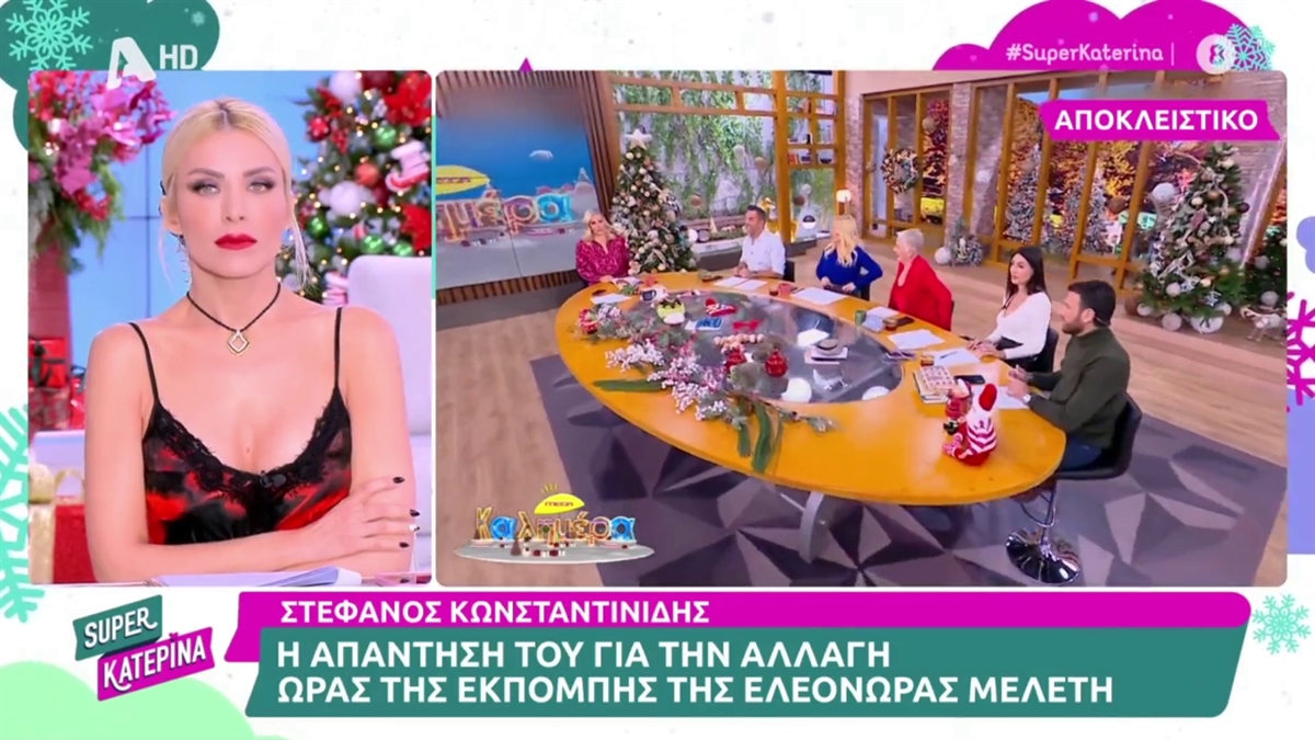 «Από σήμερα μειώθηκε κατά 20 λεπτά η εκπομπή της Ελεονώρας Μελέτη. Δεν μου άρεσε αυτό που έκανε το κανάλι, ρε παιδιά. Βγήκε αργά την Παρασκευή ένα δελτίο Τύπου. Πολύ ωραία μίλησε η Ελεονώρα το πρωί, τι να πει η κοπέλα; Είπε ότι άργησαν να βγουν στον αέρα, γιατί στόλιζαν το πλατό. Αν ήταν κάποια άλλη παρουσιάστρια, μπορεί να είχε και λίγα νεύρα για αυτό που της έκαναν.