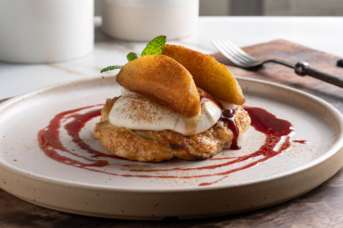 Για γλυκό, ο Άκης φτιάχνει μια σφολιάτα με καραμελωμένα μήλα και τυρί κρέμα, ένα πολύ απλό επιδόρπιο που παρασκευάζεται χρησιμοποιώντας (και) πολύ ευφάνταστα κόλπα. Πρώτα, τοποθετεί τυρί κρέμα πάνω σε ένα φύλλο σφολιάτας, προσθέτει καστανή ζάχαρη και κανέλα, διπλώνει στη μέση και κλείνει. Κόβει από τη μεγάλη πλευρά σε 8 λωρίδες, τυλίγει την κάθε λωρίδα, φτιάχνοντας μια φωλιά με την ένωση προς τα κάτω, σε σχήμα σπείρας, και μεταφέρει σε ταψί με λαδόκολλα. Αλείφει με κρόκο αραιωμένο με νερό, πασπαλίζει με καστανή ζάχαρη και ψήνει. Σε ένα μπολ ανακατεύει τυρί κρέμα, άχνη ζάχαρη και εκχύλισμα βανίλιας. Καθαρίζει κόκκινα μήλα, τα κόβει σε φέτες, τις ανακατεύει με ζάχαρη, τις μεταφέρει σε ένα τηγάνι σε δυνατή φωτιά και τις αφήνει να καραμελώσουν. Αφαιρεί τα μήλα και στο τηγάνι ρίχνει χυμό ροδιού και σιγοβράζει για 10-15 λεπτά. Βάζει τα σφολιατάκια σε ένα πιάτο σερβιρίσματος, απλώνει από πάνω το μείγμα με το τυρί κρέμα, τα μήλα, πασπαλίζει με το σιρόπι ροδιού και σερβίρει με φύλλα δυόσμου, άχνη ζάχαρη και κανέλα.
