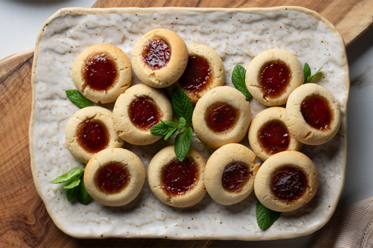 Για επιδόρπιο ο Άκης φτιάχνει μπισκότα με μαρμελάδα χωρίς ζάχαρη, από τα οποία δεν θα λείπει απολύτως τίποτα ούτε σε γεύση, ούτε σε απόλαυση, αφού πρόκειται για μια συνταγή με ελάχιστα υλικά που, όταν συνδυαστούν μεταξύ τους, δημιουργούν ένα μοναδικό θαύμα. Σε ένα μπολ βάζει μέλι, αφού το ζεστάνει πρώτα στα μικροκύματα, προσθέτει ένα αυγό, βανιλίνη, αλάτι και ελαιόλαδο και ανακατεύει. Βάζει αλεύρι, ανακατεύει πρώτα με κουτάλι και έπειτα πλάθει με τα χέρια, δημιουργεί 16 στρογγυλά μπαλάκια, κάνει στη μέση ένα μικρό βαθούλωμα και μεταφέρει σε ταψί με λαδόκολλα. Βάζει στα βαθουλώματα μαρμελάδα φράουλα, μεταφέρει στον φούρνο, ψήνει και σερβίρει.