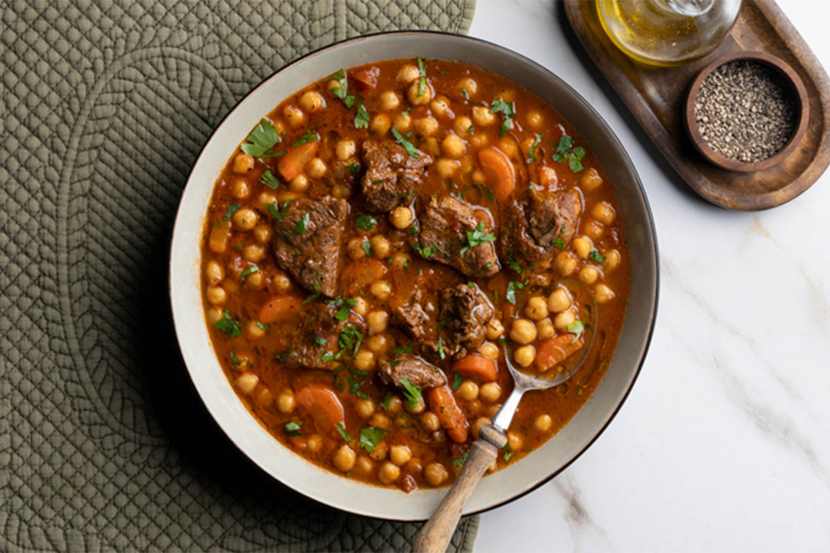 Για κυρίως γεύμα ο αγαπημένος μας σεφ προτείνει ένα μοσχαράκι κοκκινιστό με ρεβίθια, ένα γεμάτο σε γεύση φαγητό με πολλά θρεπτικά συστατικά που θα μας γεμίσει με ενέργεια και θα μας μείνει αξέχαστο με την υπέροχη γεύση του. Κόβει μοσχαρίσια ελιά σε κομμάτια, τους βάζει αλατοπίπερο και τα μεταφέρει σε μια κατσαρόλα με ελαιόλαδο για να τσιγαριστούν.