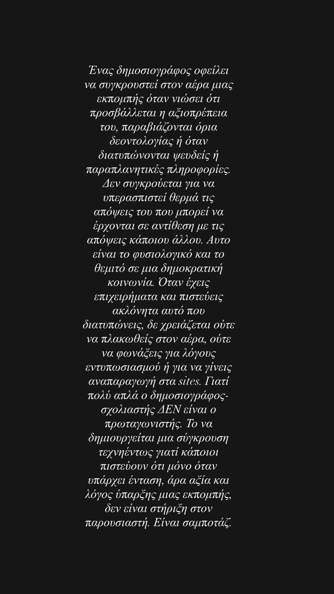 «Το να δημιουργείται μια σύγκρουση τεχνηέντως γιατί κάποιοι πιστεύουν ότι μόνο όταν υπάρχει ένταση, άρα αξία και λόγος ύπαρξης μιας εκπομπής, δεν είναι στήριξη στον παρουσιαστή. Είναι σαμποτάζ».