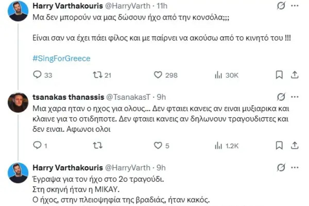 Την ίδια ώρα, ο Χάρης Βαρθακούρης ξέσπασε με αναρτήσεις του στο Twitter/X, καθώς όπως υποστήριξε υπήρξε πρόβλημα στον ήχο κατά τη διάρκεια της βραδιάς. Ο ίδιος έγραψε: «Μα δεν μπορούν να μας δώσουν ήχο από την κονσόλα; Είναι σαν να έχει πάει φίλος και με παίρνει από το κινητό του!». Κάποιοι θεώρησαν πως το σχόλιό του αφορούσε τον αδελφό του Good Job Nicky, ο οποίος εμφανίστηκε στον ημιτελικό με το «Dark Side of the Moon» και προκρίθηκε στον τελικό, ωστόσο ο καλλιτέχνης ξεκαθάρισε ότι αναφερόταν στην εμφάνιση της Mikay και γενικότερα στην ποιότητα του ήχου.