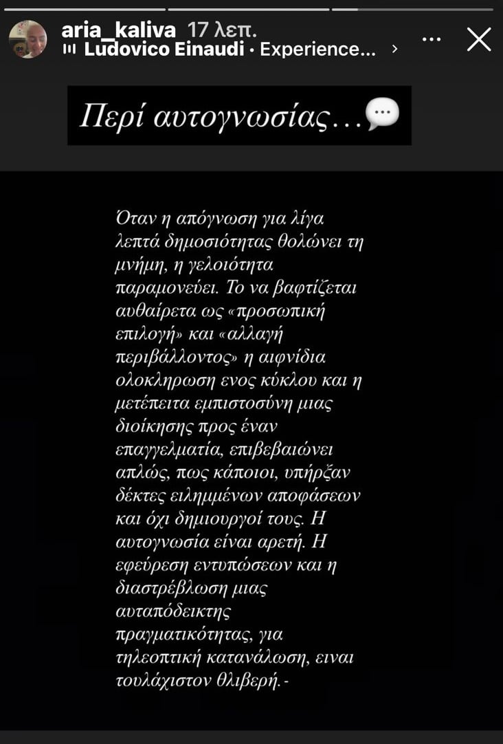 Με μια ανάρτηση γεμάτη υπονοούμενα και αιχμηρές φράσεις, η Άρια Καλύβα άναψε φωτιές το μεσημέρι της Δευτέρας 27 Απριλίου, αφήνοντας πολλούς να αναρωτιούνται σε ποιον απευθύνεται. Η δημοσιογράφος, που βρίσκεται στο επίκεντρο συζητήσεων τις τελευταίες ημέρες λόγω των δηλώσεών της για την εκπομπή «Ραντεβού το ΣΚ», δημοσίευσε ένα εκτενές κείμενο με τίτλο «Περί αυτογνωσίας», γεμάτο νόημα και… ξεκάθαρα «καρφιά».