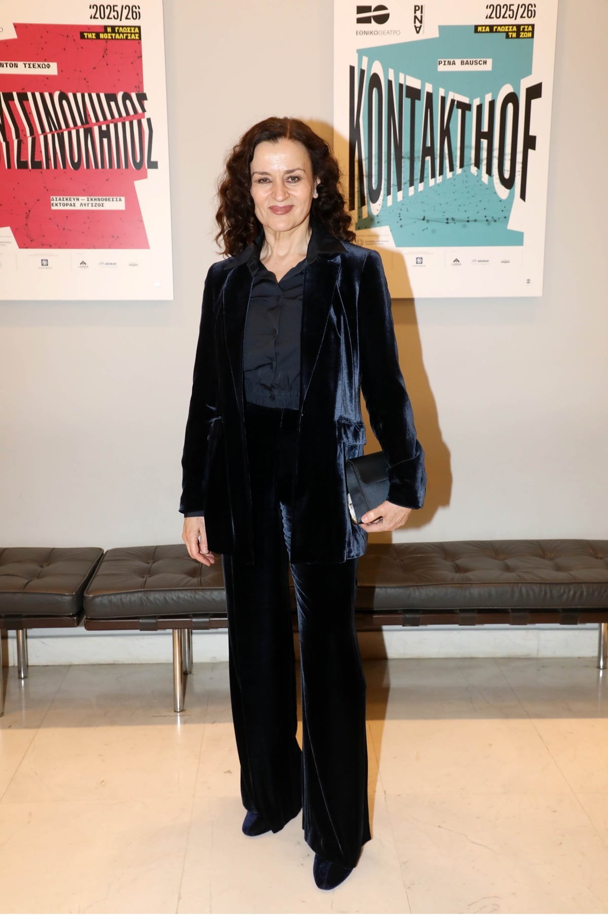 Μία εμφάνιση που αποπνέει κομψότητα, ωριμότητα και διαχρονικό minimal glamour έκανε η Καρυοφυλλιά Καραμπέτη στην επίσημη πρεμιέρα της παράστασης «Βυσσινόκηπος» στο Εθνικό Θέατρο. Επέλεξε ένα βελούδινο tailored σύνολο με έντονη αίσθηση θεατρικής κομψότητας σε σκούρο μπλε. Το σύνολο από βελούδο δίνει πολυτελή υφή και βάθος, ενώ το χαλαρό αλλά καλοραμμένο κόψιμο κάνει το σύνολο κομψό, χωρίς να φαίνεται αυστηρό. Το συνδύασε με μαύρο πουκάμισο προσδίδοντας έναν sophisticated αέρα στο outfit.