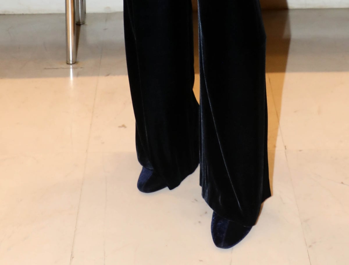 Τα σκούρα βελούδινα παπούτσια της χάνονται μέσα στο παντελόνι, διατηρώντας τη ροή της γραμμής. Παράλληλα διατήρησε τα μαλλιά της σε φυσικές κυματιστές μπούκλες και επέλεξε διακριτικό μακιγιάζ που δίνει έμφαση στο πρόσωπο και νεανικότητα. Επέλεξε επίσης πολύ διακριτικά σκουλαρίκια στα αφτιά της και απουσία άλλων κοσμημάτων στα χέρια ή τον λαιμό. Ένα outfit ιδανικό για μία εμφάνιση σε θέατρο, πρεμιέρα ή πολιτιστική εκδήλωση.