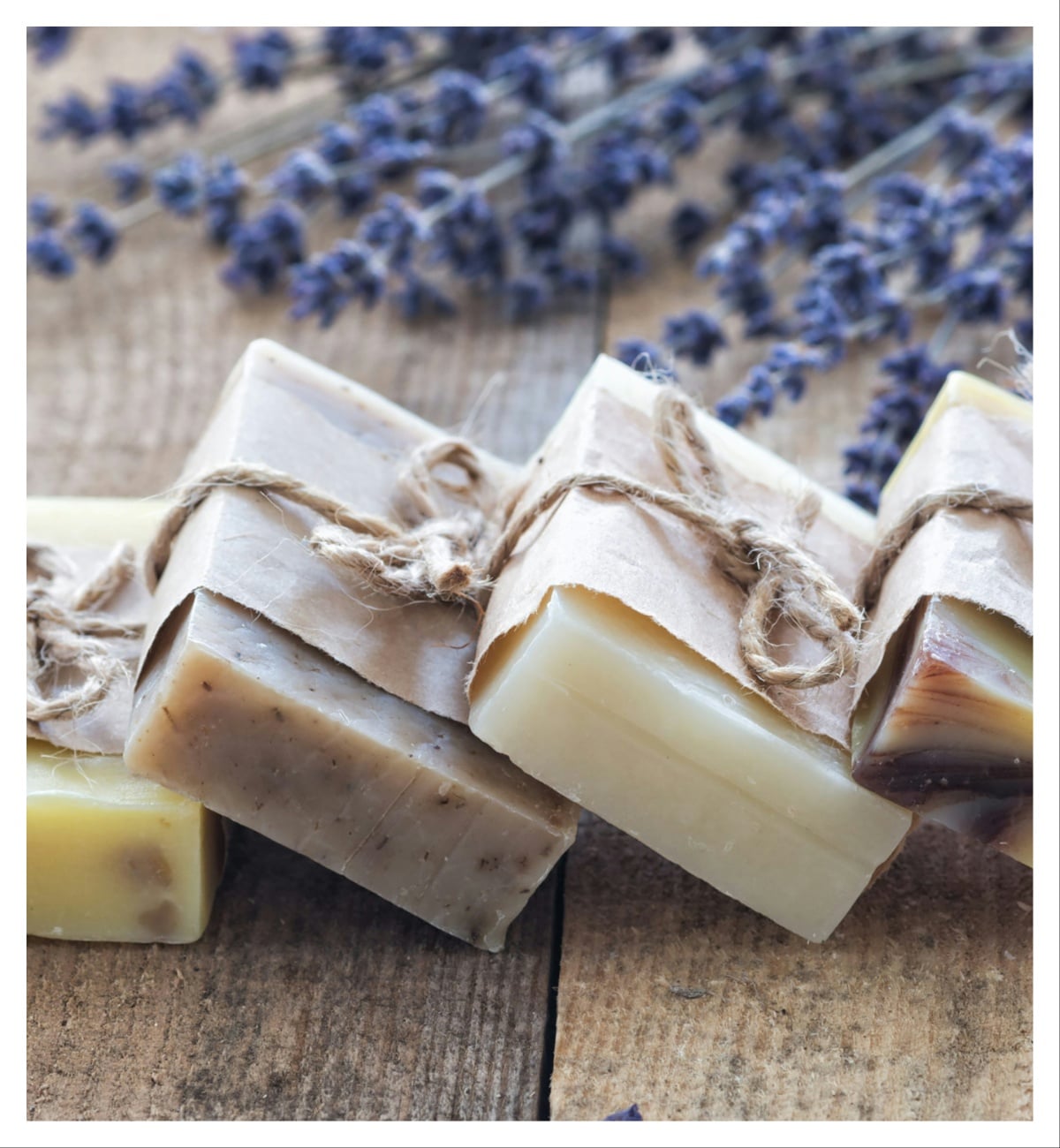 Υλικά:200 γρ. ελαιόλαδο, 50 γρ. καστορέλαιο, 50 γρ. λάδι καρύδας, 70 γρ. καυστική σόδα, 180 ml νερό, αιθέρια έλαια (λεβάντα, μέντα, πορτοκάλι), Βότανα ή άνθη για διακόσμηση (π.χ. χαμομήλι, ρόδο)