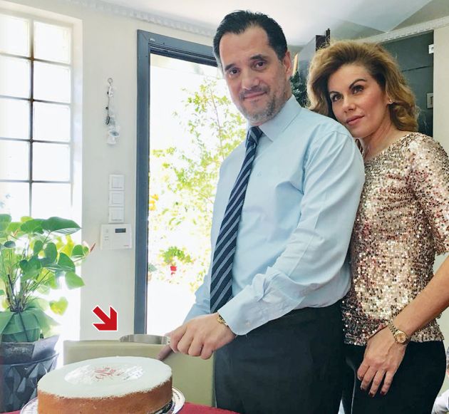 Στη φωτογραφία, που έγινε viral, ο Αδωνις Γεωργιάδης κρατάει ένα μαχαίρι βουτύρου και ετοιμάζεται να ριχτεί στην… αναζήτηση του πρωτοχρονιάτικου φλουριού, ενώ η σύζυγός του, Ευγενία, φορώντας μία μπλούζα με χρυσές παγιέτες, έχει γείρει πάνω του και κοιτάζει τον φακό! Η γιορτινή φωτογραφία συνοδεύεται από τις απαραίτητες ευχές για υγεία και ευτυχία.