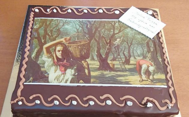 Παρήγγειλαν μια τούρτα που όμοιά της δεν έχουμε ξαναδεί (πρωτοπόροι σε όλα και χιουμορίστες οι συριζαίοι) και η οποία απεικόνιζε μια αγρότισσα με το καλάθι στον ώμο να μαζεύει τις ελιές της στο χωράφι.