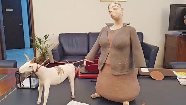 Πρόκειται για γνωστό «βουκολικό» πίνακα ζωγραφικής, που πολλάκις έχουμε δει στην περιφέρεια. Δεν καταφέραμε να εντοπίσουμε τον ζωγράφο, αλλά είναι η πρώτη φορά που βλέπουμε κάτι παρόμοιο σε τούρτα! Και σαν να μην έφτανε αυτό, οι συνεργάτες της Ολυμπίας Τελιγιορίδου τής χάρισαν και ανάλογα δωράκια, ήτοι ένα αγαλματάκι-ομοίωμα αγρότισσας που κρατά το ζωάκι της και το πηγαίνει για βοσκή στο χωράφι.