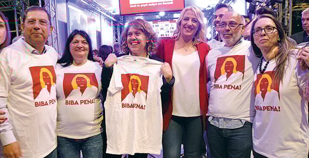 Με μπλουζάκια που έγραφαν «Βίβα, Ρένα» υποδέχτηκαν τη Ρένα Δούρου οι υποστηρικτές της στα εγκαίνια του εκλογικού κέντρου του συνδυασμού της.