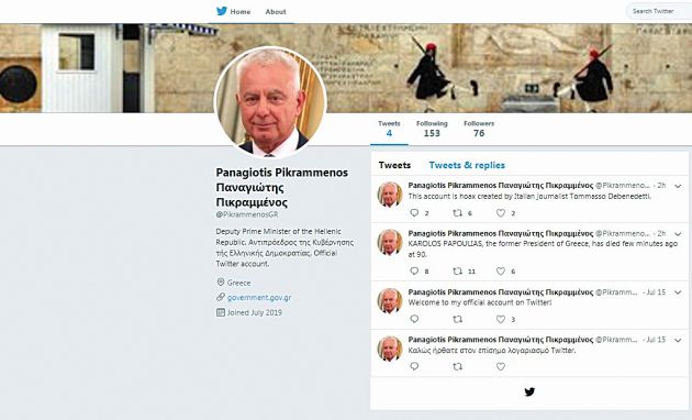 Η μακάβρια ανάρτηση του Ιταλού φαρσέρ έγινε στο twitter από ψεύτικο λογαριασμό (μικρή φωτό) που δημιούργησε στο όνομα του αντιπροέδρου της κυβέρνησης Παναγιώτη Πικραμμένου.