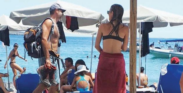 Στην ίδια χαλαρή διάθεση, με μαγιό και παρεό, εμφανίστηκε στην παραλία και η σύζυγός του Μαρέβα, η οποία άφησε για λίγο το ultra chic στιλ της και απόλαυσε τον ήλιο και τη θάλασσα. Αμέσως μετά, το ζευγάρι γεύθηκε κρητικές νοστιμιές σε παραδοσιακή ταβέρνα μπροστά στη θάλασσα.