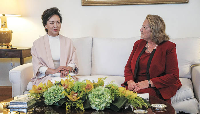 Η Λιγουάν στο δικό της παράλληλο πρόγραμμα με εκείνο του συζύγου της συναντήθηκε με την κυρία Σίσσυ Παυλοπούλου, τη σύζυγο του Προέδρου της Δημοκρατίας Προκόπη Παυλόπουλου.