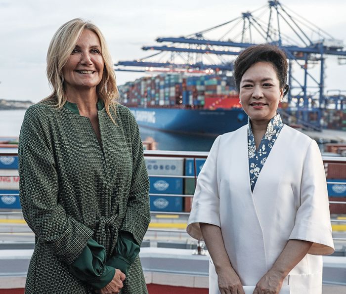 Με ιβουάρ φόρεμα εμφανίστηκε η Πενγκ Λιγουάν και στην επίσκεψη που έκανε μαζί με τον σύζυγό της Σι Τζινπίνγκ, τον Κυριάκο Μητσοτάκη και τη Μαρέβα Γκραμπόφσκι στις εγκαταστάσεις της Cosco στον Πειραιά.