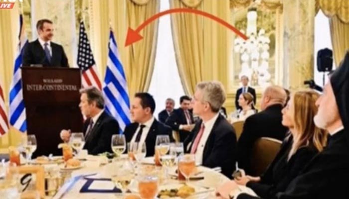 Σε δείπνο ομογενών στις ΗΠΑ, όπου μίλησε ο Μητσοτάκης, οι ελληνικές σημαίες ήταν ανάποδα!