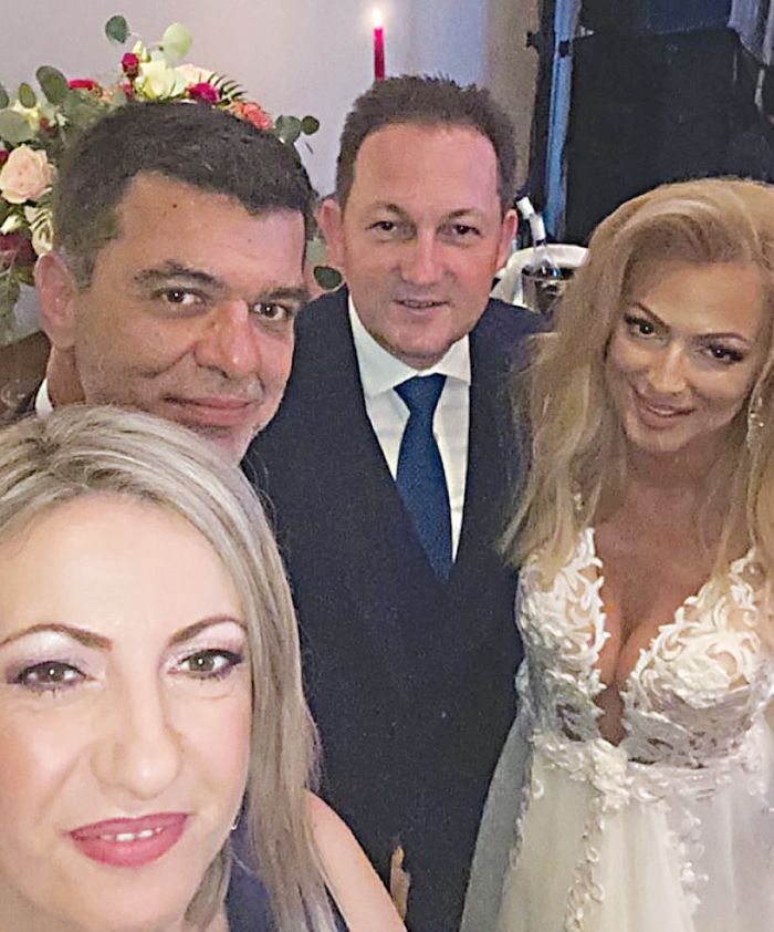 Ο θερμός εναγκαλισμός έξω από την εκκλησία του γαμπρού με τον κυβερνητικό εκπρόσωπο έδειξε τη φιλία που τους συνδέει. Μετά τον γάμο, όλοι μαζί διασκέδασαν στον πολυχώρο γάμων Gala, στην Ανοιξη, εκεί όπου… κάηκε το πελεκούδι. Το ζευγάρι μπήκε χορεύοντας τσιφτετέλι στην αίθουσα.