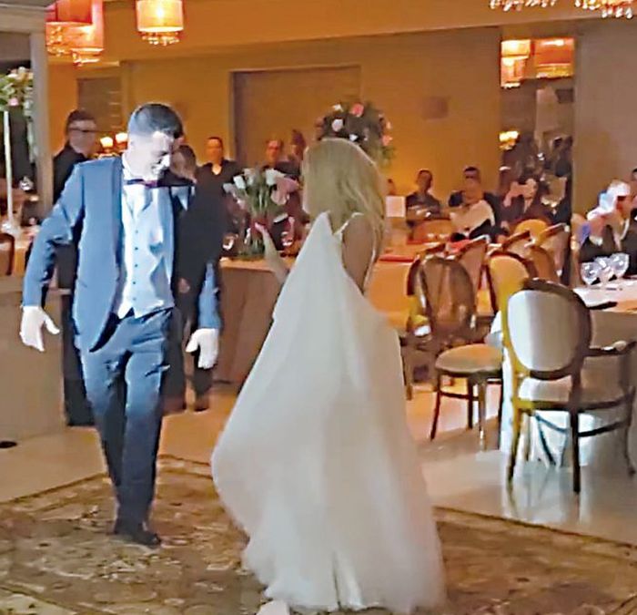 Η νύφη μάλιστα κρατούσε την ανθοδέσμη του γάμου της και, χωρίς τακούνια, άρχισε να χορεύει με τον σύζυγό της οργανικό παραδοσιακό κομμάτι με τύμπανο, πηγαίνοντας από τραπέζι σε τραπέζι.