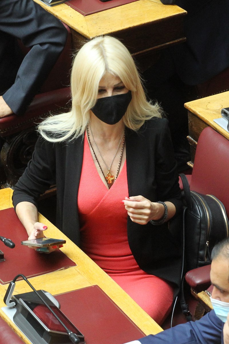 Με κομψή και εντυπωσιακή εμφάνιση εθεάθη η βουλευτής στα έδρανα του Κοινοβουλίου.