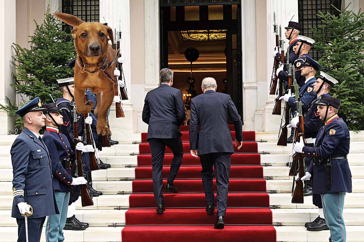 Υστερα, ξαφνιάζοντας τους πάντες, ο Ερντογάν προτίμησε να πάει με τα πόδια στο διπλανό Μέγαρο Μαξίμου, περπατώντας για περίπου δέκα λεπτά, καθώς το πήγαινε γιαβάς γιαβάς! Και εκεί, στο Μαξίμου, άρχισε το show για χάρη των τηλεοπτικών συνεργείων, με γκεστ τον τετράποδο Πίνατ!