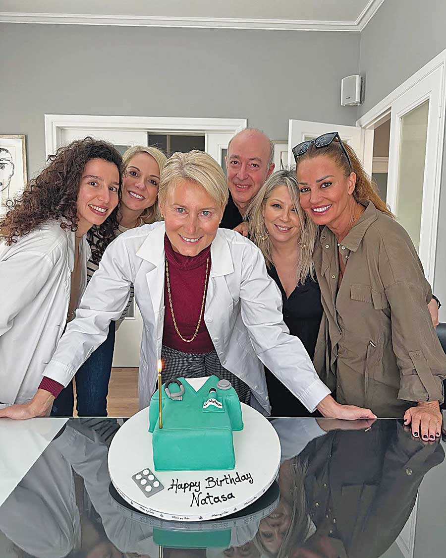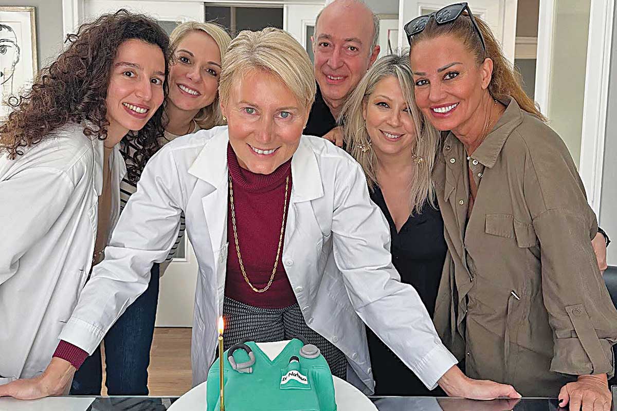 Δημιούργησαν μια αμιγώς «ιατρική» τούρτα με την πράσινη ρόμπα του χειρουργείου, και η σύζυγος του πρώην πρωθυπουργού Κώστα Καραμανλή, ενθουσιασμένη, έσβησε το κεράκι της εντυπωσιακής τούρτας.