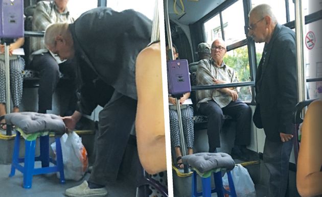 Ο γηραιός παππούς της φωτογραφίας πήρε το τρόλεϊ για τα Πατήσια μαζί και το πλαστικό σκαμπό του, για να καθίσει. Ετσι κατάντησαν τα «περήφανα γηρατειά» του Ανδρέα Παπανδρέου. Με σύνταξη ψίχουλα και βόλτα με το σκαμπό, αφού στο καφενείο δεν μπορούν πλέον να πάνε. Παίρνει το καθισματάκι του, λοιπόν, ο παππούς και το πάει περίπατο, μέσα κι έξω από το τρόλεϊ!